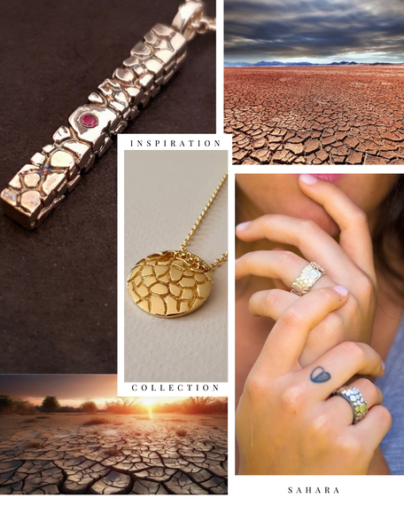 De ce moment est née Sahara. J’ai voulu capturer dans le métal la texture vivante de ces paysages arides, figer dans la matière les cicatrices sublimes de la terre. À l’établi, mes mains ont reproduit ces lignes irrégulières, ces aspérités délicates, comme on garde précieusement un fragment d’horizon.